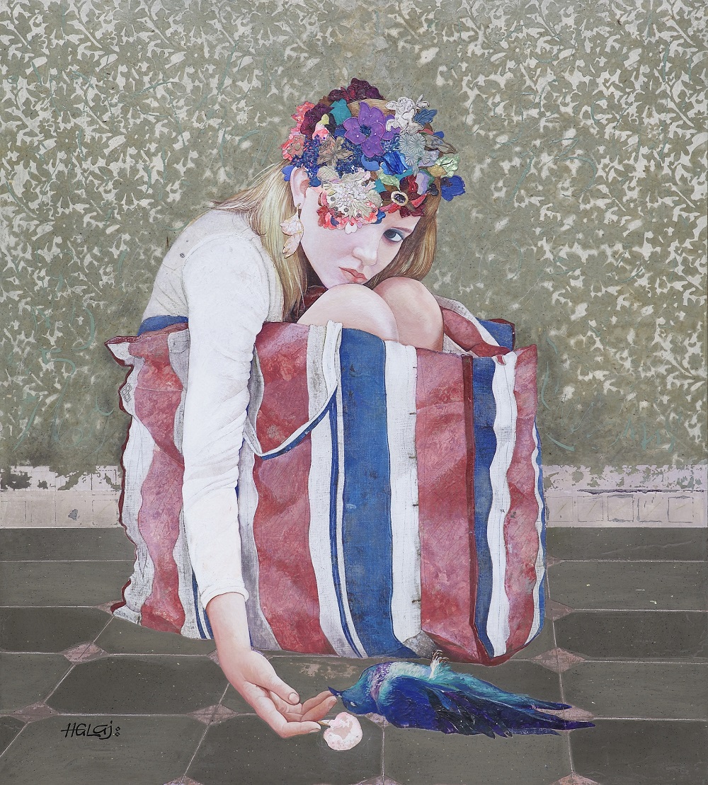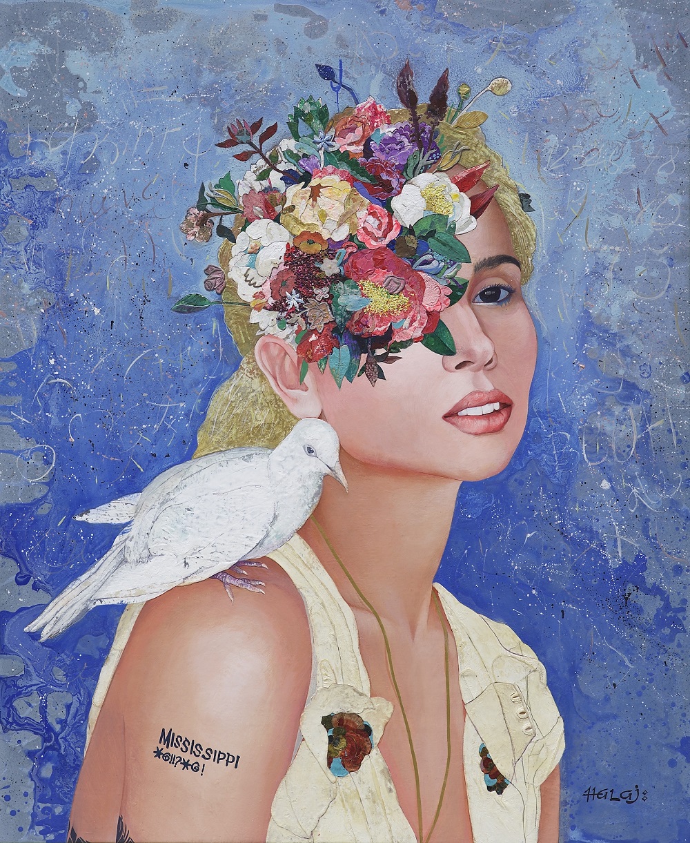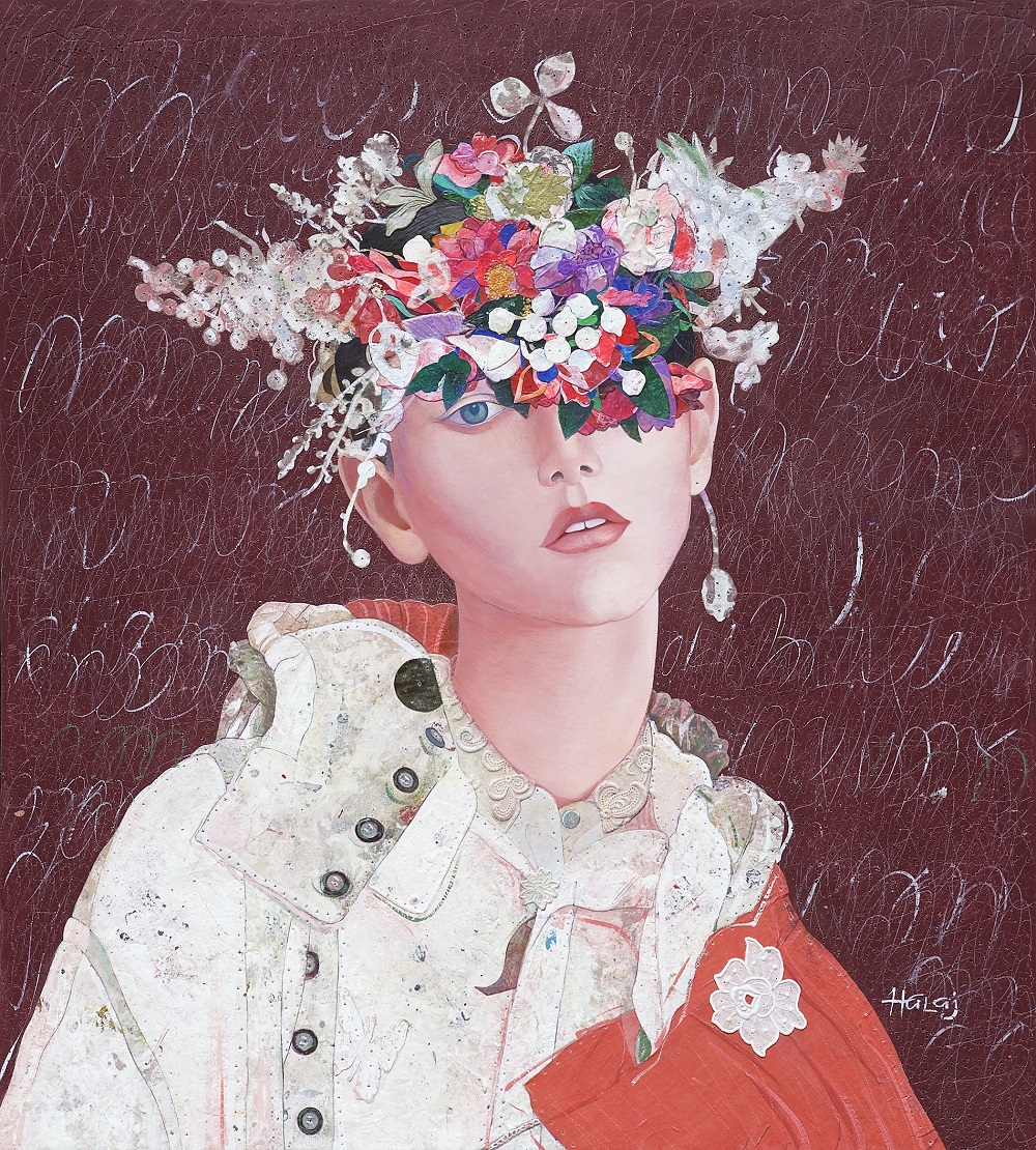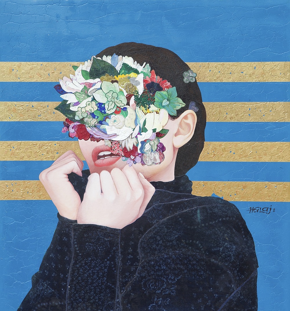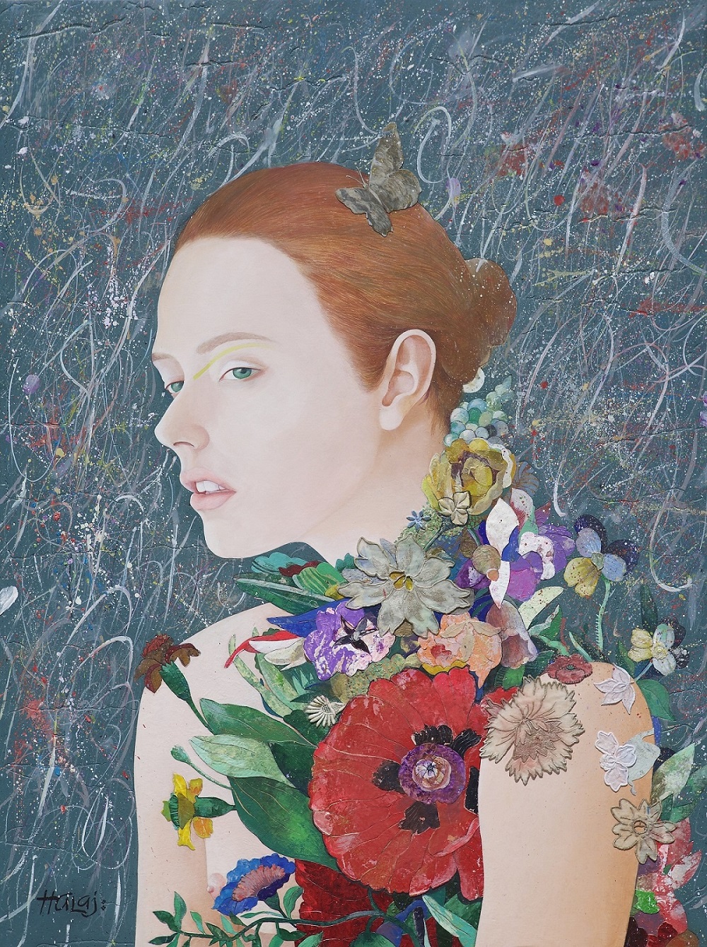“ Floral Mind # 46 “ 2018,Oil, textile, wax, mixed media on panel, 40×30 inches. (101.6×76.2 cm.)